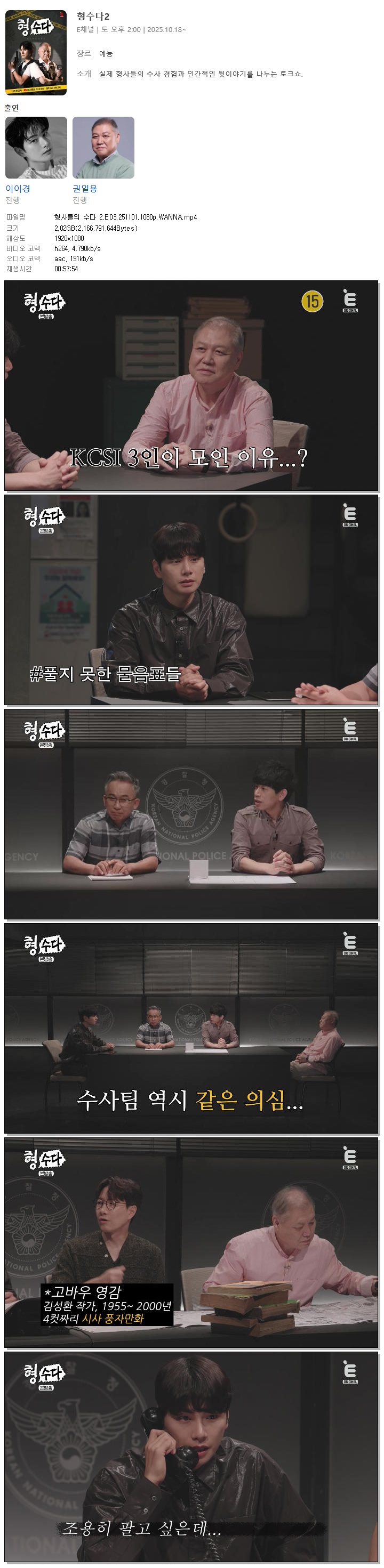 | [E채널] 형사들의 수다 2.E03.251101.1080p.WANNA[이이경, 권일용].mp4 | 2 G | 00:57:54 | 1920x1080 |
