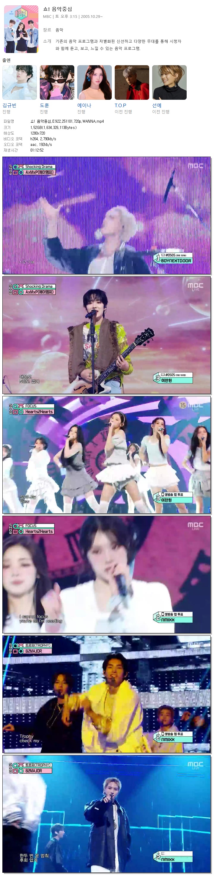 ♬ Comeback ♥ Stage ♬ · 강렬한 사운드로 잠들어있던 감성을 깨우는 하드코어 록의 최강자 닥터코어911! - 닥터코어911『PK2』 · 감미로운 보컬과 여운이 남는 노랫말로 리스너들의 마음에 깊은 파장을 일으킬 정승환! - 정승환『앞머리』 · 강렬하고 매혹적인 퍼포먼스로 다시 한번 빛나는 존재감을 각인시킬 원호! - 원호『if you wanna』 · 처음 맛보는 음악으로 글로벌 팬들의 마음을 단번에 사로잡을 DKZ! - DKZ『Replay My Anthem』 · 위아이(WEi)가 팬들에게 전하는 가장 따뜻한 위로이자 약속의 메시지! - 위아이(WEi)『HOME』 · 두려움 속에서도 한 걸음씩 나아가는 이들에게 위로가 되어줄 TEMPEST(템페스트)! - TEMPEST(템페스트)『In The Dark (어둠 속에서)』 · 스스로의 존재를 증명할 트로피를 들고 돌아온 공연형 아이돌 82MAJOR! - 82MAJOR『트로피(TROPHY)』 · 압도적인 에너지로 더 뜨겁고 더 거칠게 무대를 집어삼킬 K팝 루키 NEXZ! - NEXZ『Beat-Boxer』 ♬ Hot Debut ★ Stage ♬ · 더 큰 세상을 향해 달려가는 &TEAM의 굳은 의지와 긍정의 에너지! - &TEAM『Back to Life』 ♬ Hot ☆ Stage ♬ · 따뜻한 보이스와 여유 있는 무대 매너로 팬들의 마음을 사로잡을 이찬원! - 이찬원『오늘은 왠지』 · 휘감기는 스파게티처럼 벗어날 수 없는 매력으로 K팝에 감칠맛을 더할 LE SSERAFIM! - LE SSERAFIM『SPAGHETTI』 · 멈추지 않고 성장을 거듭하는 BOYNEXTDOOR의 당찬 패기와 거침없는 자신감! - BOYNEXTDOOR『Hollywood Action』 · 사랑에 푹 빠진 청춘의 역동적인 감정을 노래하는 5세대 대표 올라운더 TWS! - TWS『OVERDRIVE』 · 멈출 수 없는 상승세! 더 높은 곳으로 비상할 BABYMONSTER의 자신감 넘치는 포부! - BABYMONSTER『WE GO UP』 · 숨이 멎을지라도 멈추지 않겠다는 다짐으로 흔들림 없이 전진하는 MEOVV! - MEOVV『BURNING UP』 · 질주하는 레이싱카처럼 꿈을 향해 거침없이 나아가는 izna의 청춘 에너지! - izna『Racecar』 · 모든 시선을 완벽히 사로잡을 칼각 퍼포먼스 대표주자 Hearts2Hearts! - Hearts2Hearts『FOCUS』 ♬ Sound J Holic ♬ · 음악에 대한 진정성과 열정을 담아낸 무대로 새로운 챕터를 열 BAE173! - BAE173『Turned Up』 · 아직 완성되지 않은 순간들의 반짝임을 그려내는 청춘 AxMxP(에이엠피)! - AxMxP(에이엠피)『Shocking Drama』 ♬ New ♡ Song ♬ · 누구나 따라 하기 쉬운 멜로디와 안무로 강력한 중독성을 일으킬 VVUP! - VVUP『House Party』 · 같은 상처를 지닌 누군가에게 위로의 손길을 내미는 PENTACLE(펜타클)! - PENTACLE(펜타클)『Shame』 ▩ 출연자 ▩ 닥터코어911 . 정승환 . 원호 . 이찬원 . DKZ . 위아이(WEi) . BAE173 . TEMPEST(템페스트) . LE SSERAFIM . &TEAM . BOYNEXTDOOR . 82MAJOR . TWS . VVUP . BABYMONSTER . NEXZ . MEOVV . izna . Hearts2Hearts . AxMxP(에이엠피) . PENTACLE(펜타클)
