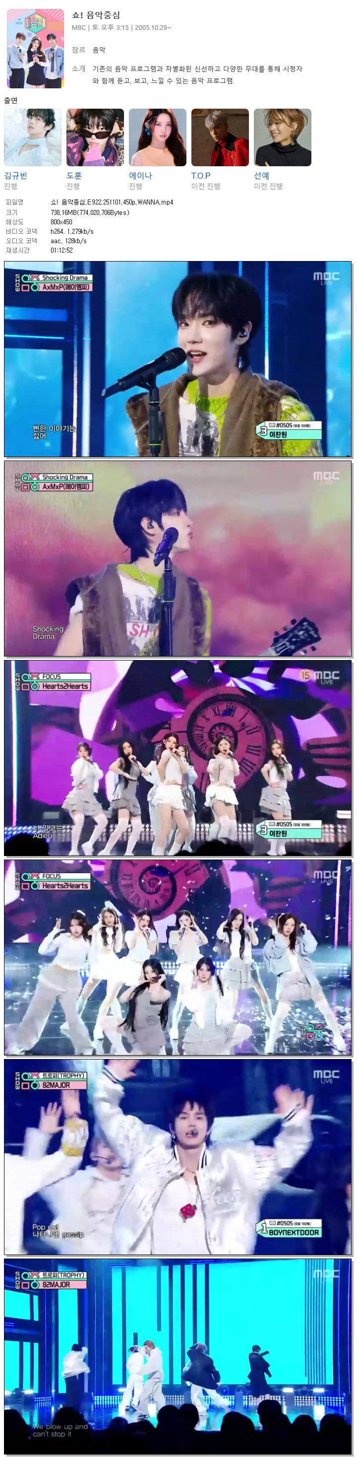 | [MBC] 쇼! 음악중심.E922.251101.450p.WANNA[정승환, 위아이].mp4 | 738.2 M | 01:12:52 | 800x450 |