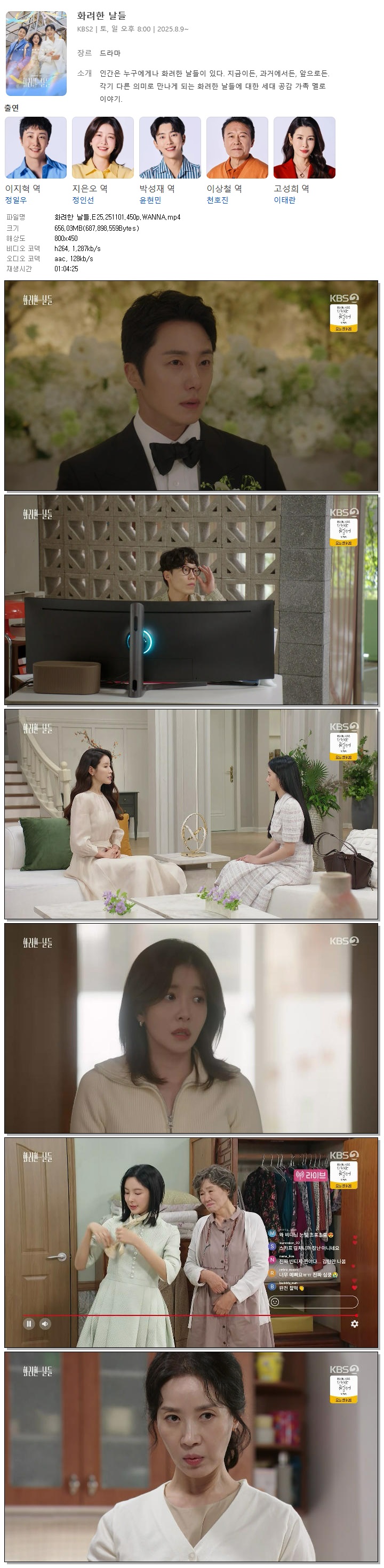 | [KBS2] 화려한 날들.E25.251101.450p.WANNA[정일우, 정인선].mp4 | 656 M | 01:04:25 | 800x450 |