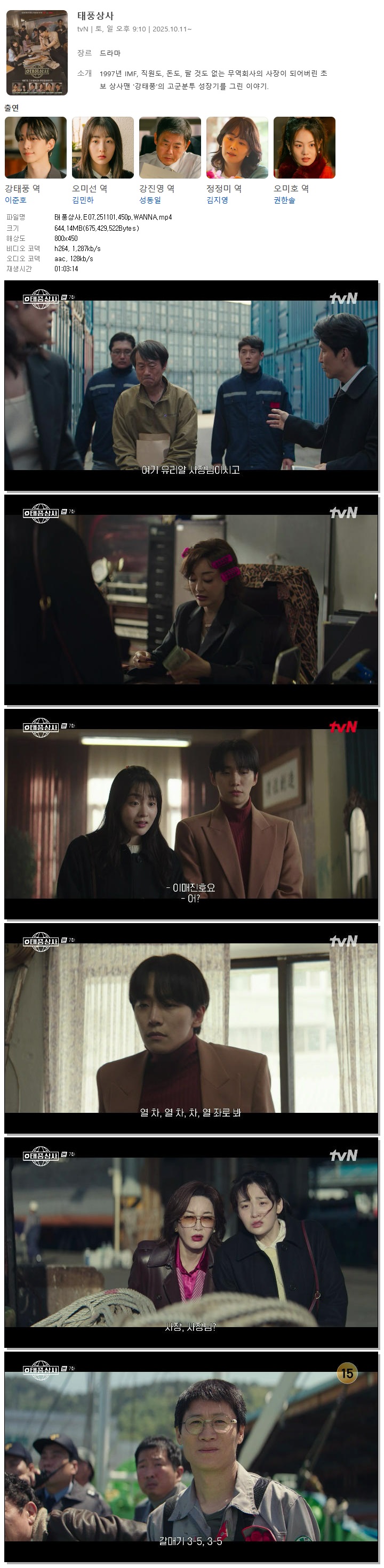 | [TVN] 태풍상사.E07.251101.450p.WANNA[이준호, 김민하].mp4 | 644.1 M | 01:03:14 | 800x450 |