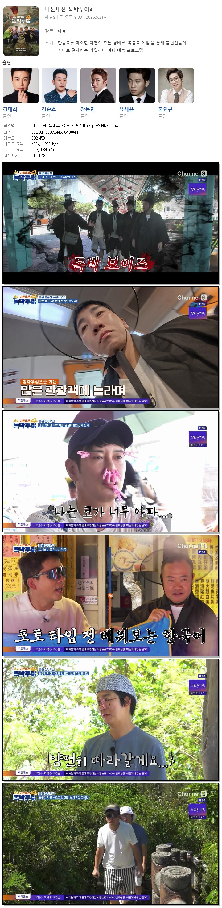 | [채널S] 니돈내산 독박투어4.E23.251101.450p.WANNA[장동민, 유세윤].mp4 | 863.5 M | 01:24:43 | 800x450 |