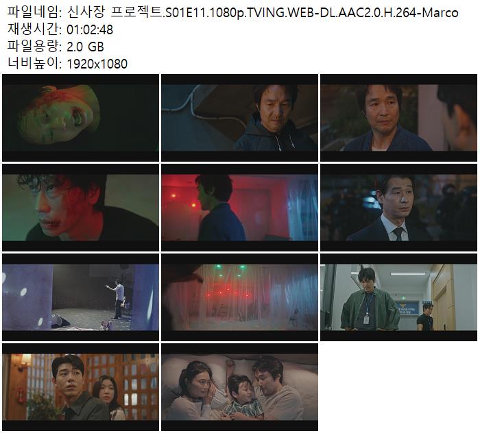 | 신사장 프로젝트.S01E11.1080p.TVING.WEB-DL.AAC2.0.H.264-Marco.mkv | 2 G | 01:02:00 | 1920x1080 |