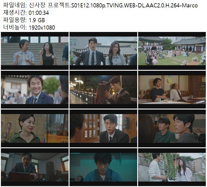 | 신사장 프로젝트.S01E12.1080p.TVING.WEB-DL.AAC2.0.H.264-Marco.mkv | 1.9 G | 01:00:00 | 1920x1080 |