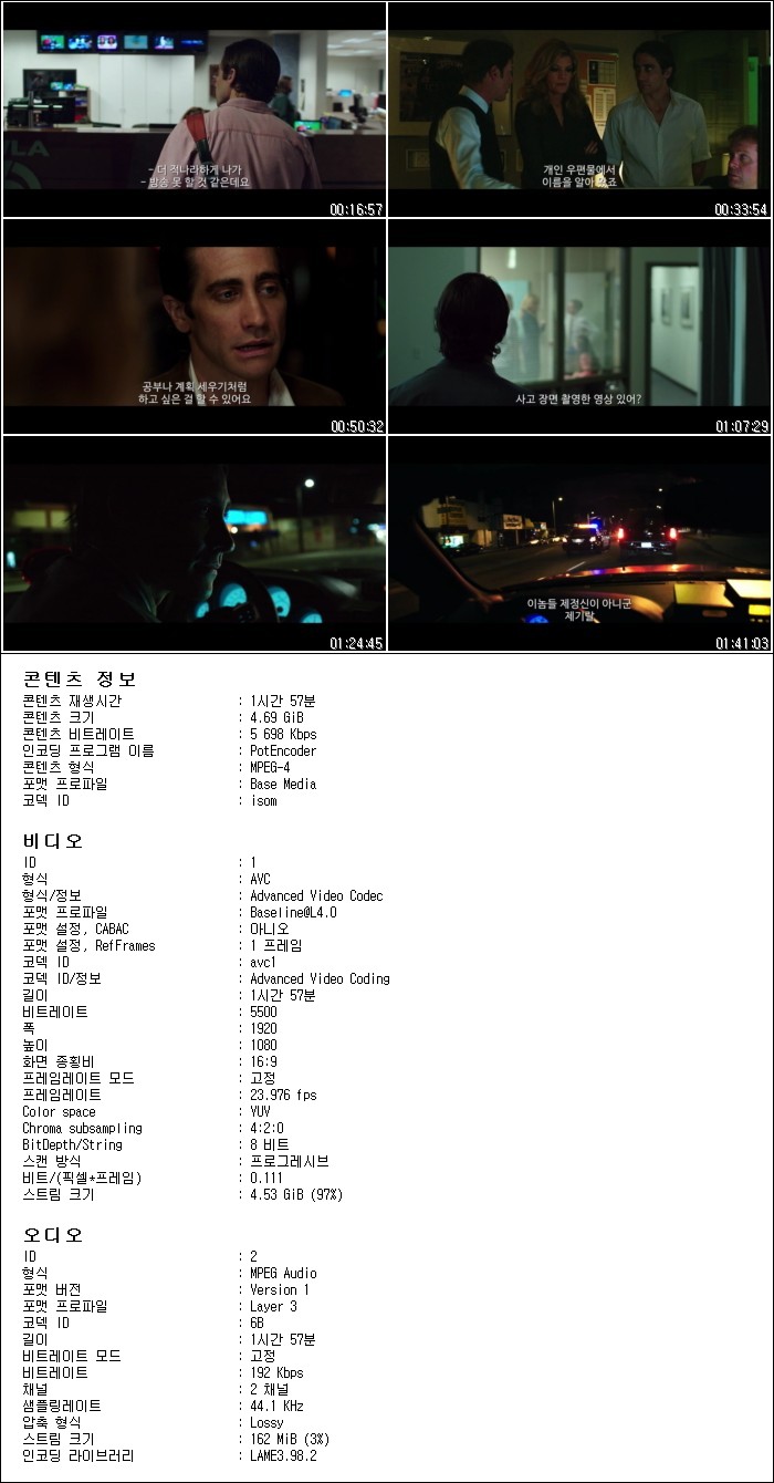 | 나이트 크롤러_자막O_등급O_1080.mp4 | 4.7 G | 01:57:52 | 1920x1080 |