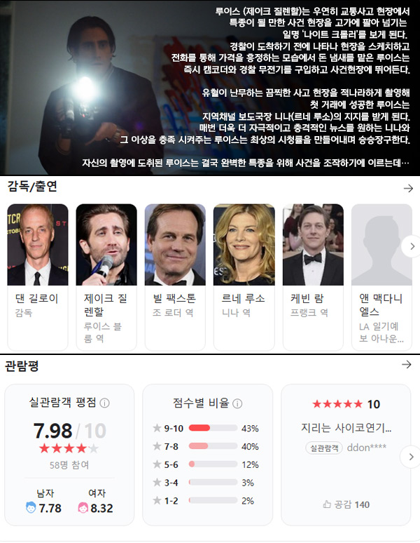 특종 추적 스릴러[나이트 크롤러]제이크 질렌할 지리는 싸패연기