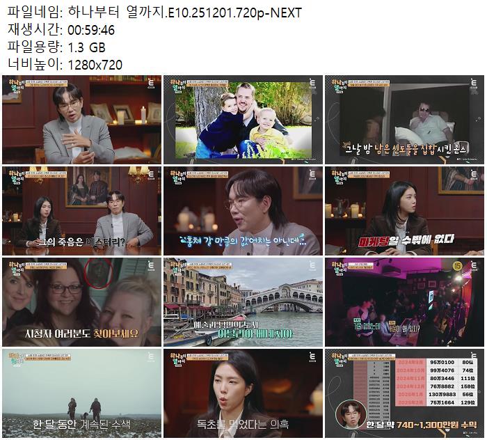 | 하나부터 열까지.E10.251201.720p-NEXT.mp4 | 1.3 G | 00:59:46 | 1280x720 |