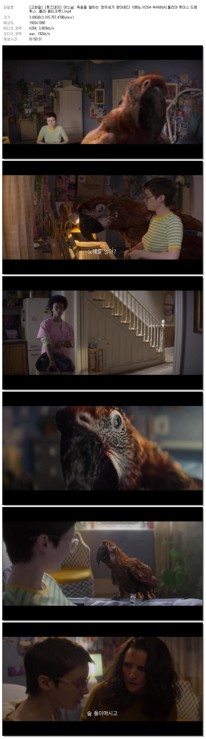 | [고화질] [튜즈데이] 어느날, 죽음을 말하는 앵무새가 찾아왔다 1080p.H264-WANNA[줄리아 루이스 드레퓌스, 롤라 페티크루].mp4 | 3.1 G | 01:50:31 | 1920x1080 |