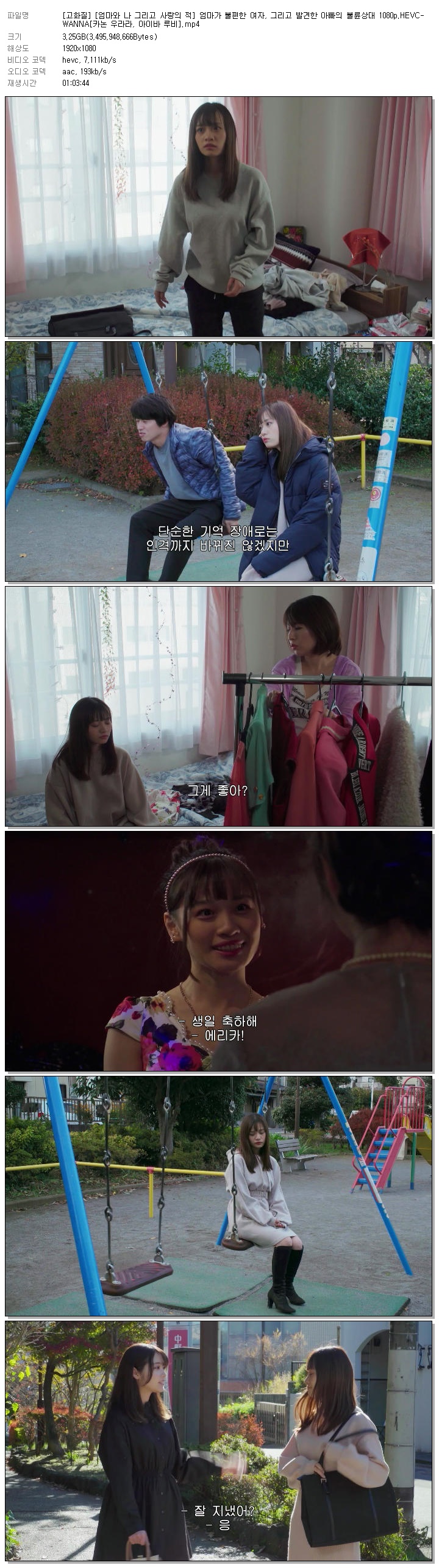 | [고화질] [엄마와 나 그리고 사랑의 적] 엄마가 불편한 여자, 그리고 발견한 아빠의 불륜상대 1080p.HEVC-WANNA[카논 우라라, 아이바 루비].mp4 | 3.3 G | 01:03:44 | 1920x1080 |
