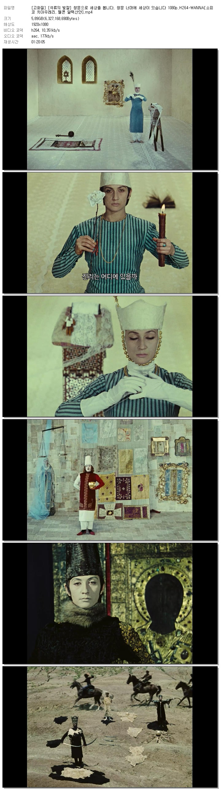 | [고화질] [석류의 빛깔] 창문으로 세상을 봅니다. 창문 너머에 세상이 있습니다 1080p.H264-WANNA[소피코 치아우레리, 멜콘 알렉산얀].mp4 | 5.9 G | 01:20:05 | 1920x1080 |