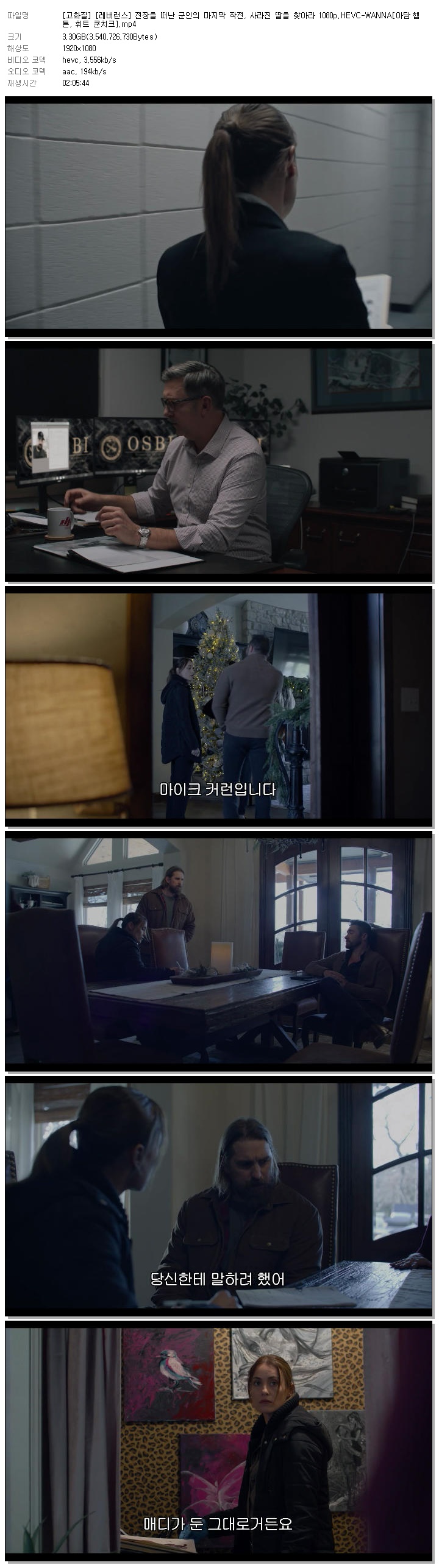 | [고화질] [레버런스] 전장을 떠난 군인의 마지막 작전, 사라진 딸을 찾아라 1080p.HEVC-WANNA[아담 햄튼, 휘트 쿤치크].mp4 | 3.3 G | 02:05:44 | 1920x1080 |