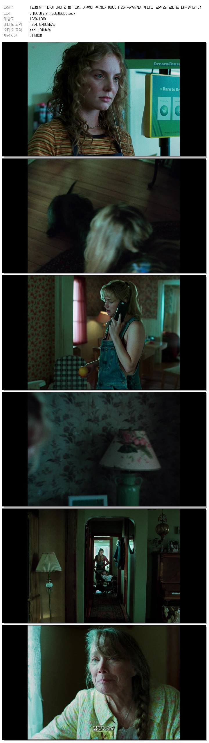 | [고화질] [다이 마이 러브] 나의 사랑이 죽었다 1080p.H264-WANNA[제니퍼 로렌스, 로버트 패틴슨].mp4 | 7.2 G | 01:58:31 | 1920x1080 |