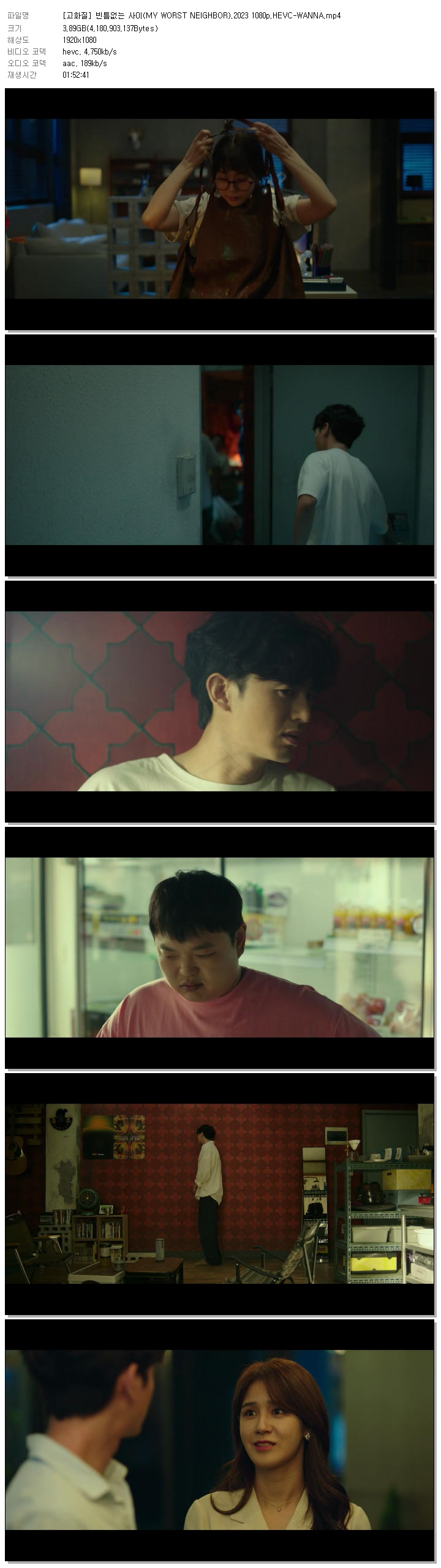[고화질] 빈틈없는 사이(MY WORST NEIGHBOR).2023 1080p.HEVC-WANNA.mp4 3.9 G 01:52:41 1920x1080