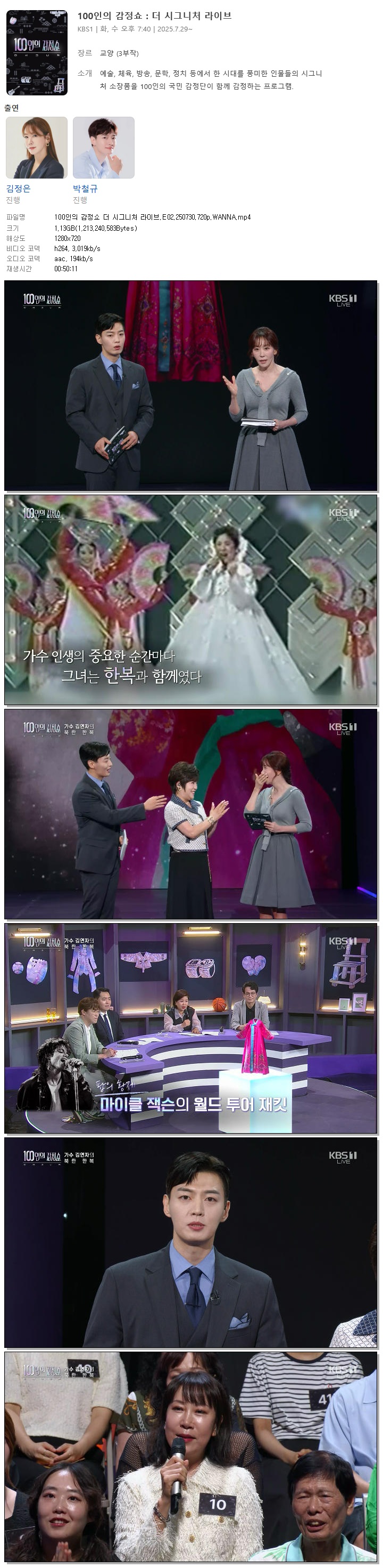 [KBS1] 100인의 감정쇼 더 시그니처 라이브.E02.250730.720p.WANNA[김정은, 박철규].mp4 | 1.1 G | 00:50:11 | 1280x720 |