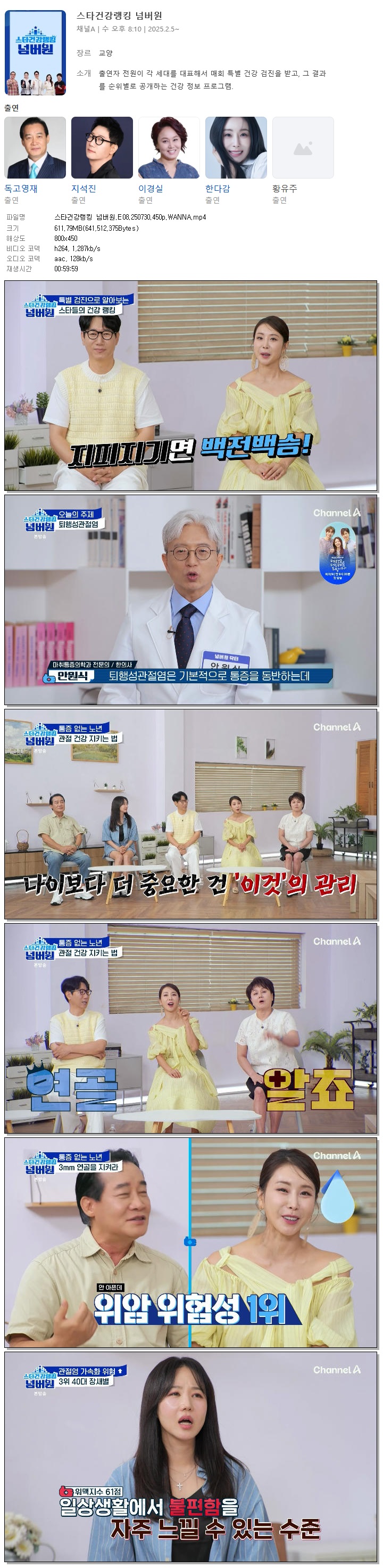 [채널A] 스타건강랭킹 넘버원.E08.250730.450p.WANNA[지석진, 이경실].mp4 | 611.8 M | 00:59:59 | 800x450 |