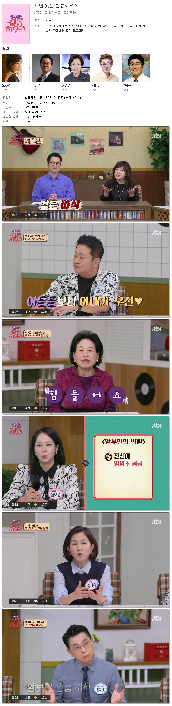 | [JTBC] 쌀롱하우스.E213.251101.1080p.WANNA[노사연, 지상렬].mp4 | 1.6 G | 00:45:26 | 1920x1080 |