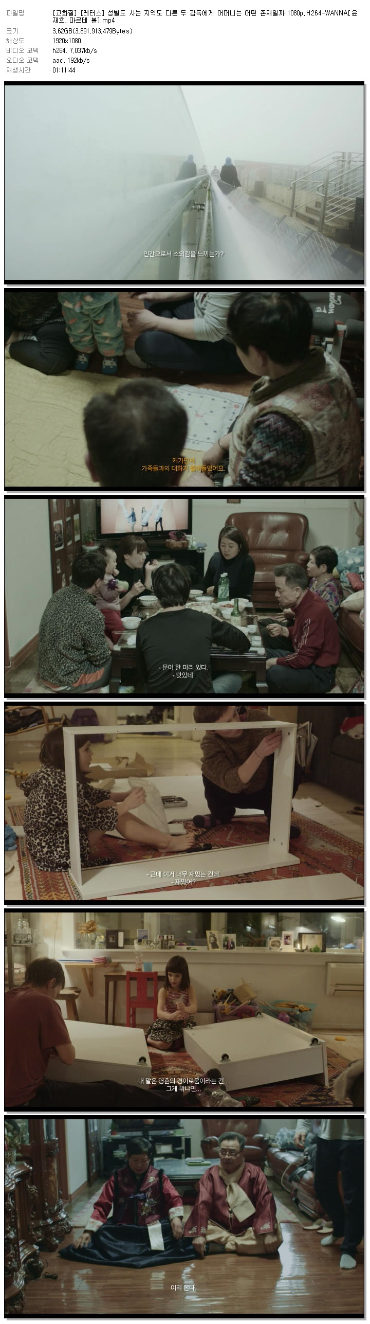 [고화질] [레터스] 성별도 사는 지역도 다른 두 감독에게 어머니는 어떤 존재일까 1080p.H264-WANNA[윤재호, 마르테 볼].mp4 3.6 G 01:11:44 1920x1080